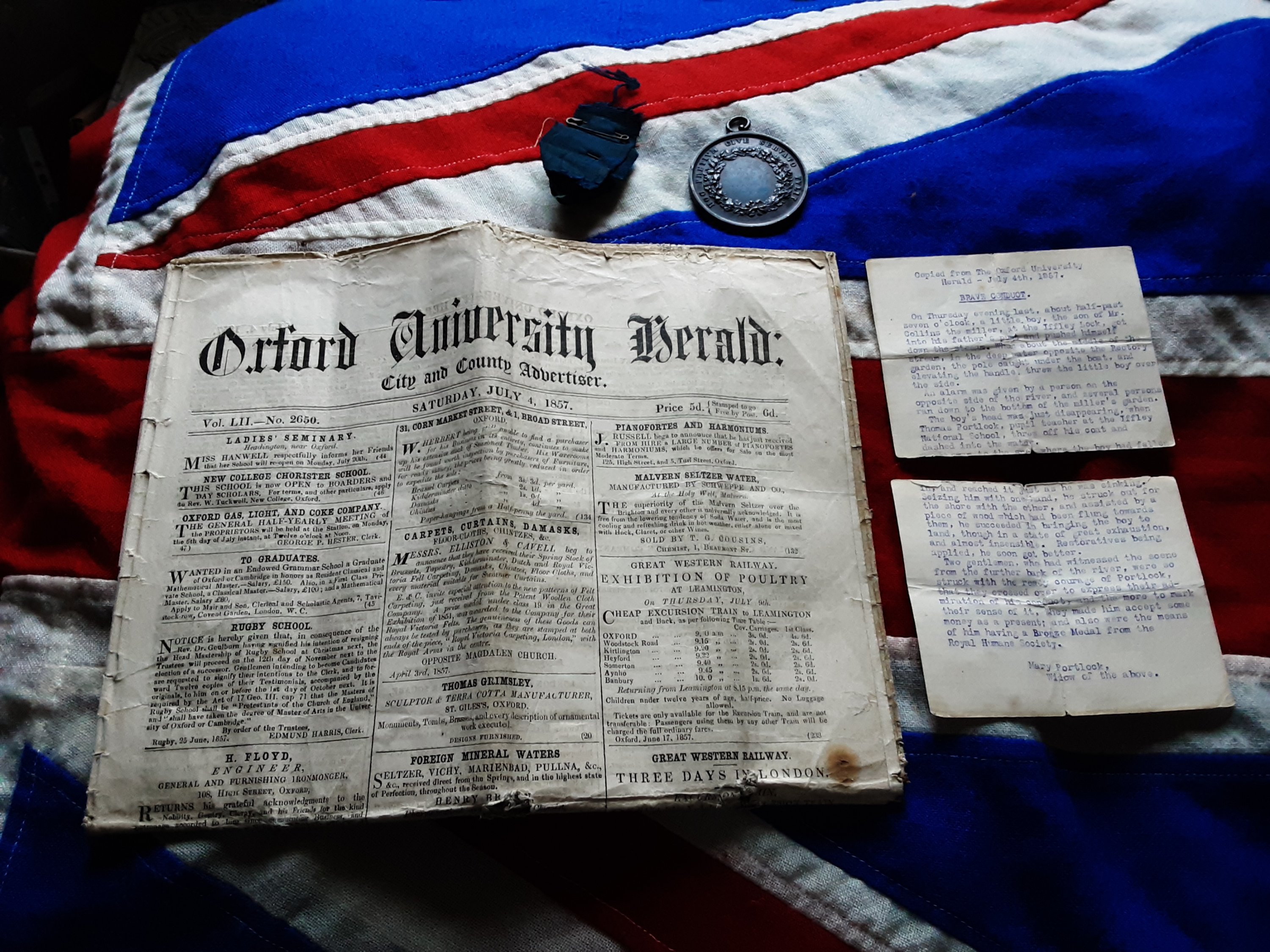 Royal Humane Society Medal & ephemera. 1857. Thomas Portlock. Iffley Lock, Oxford