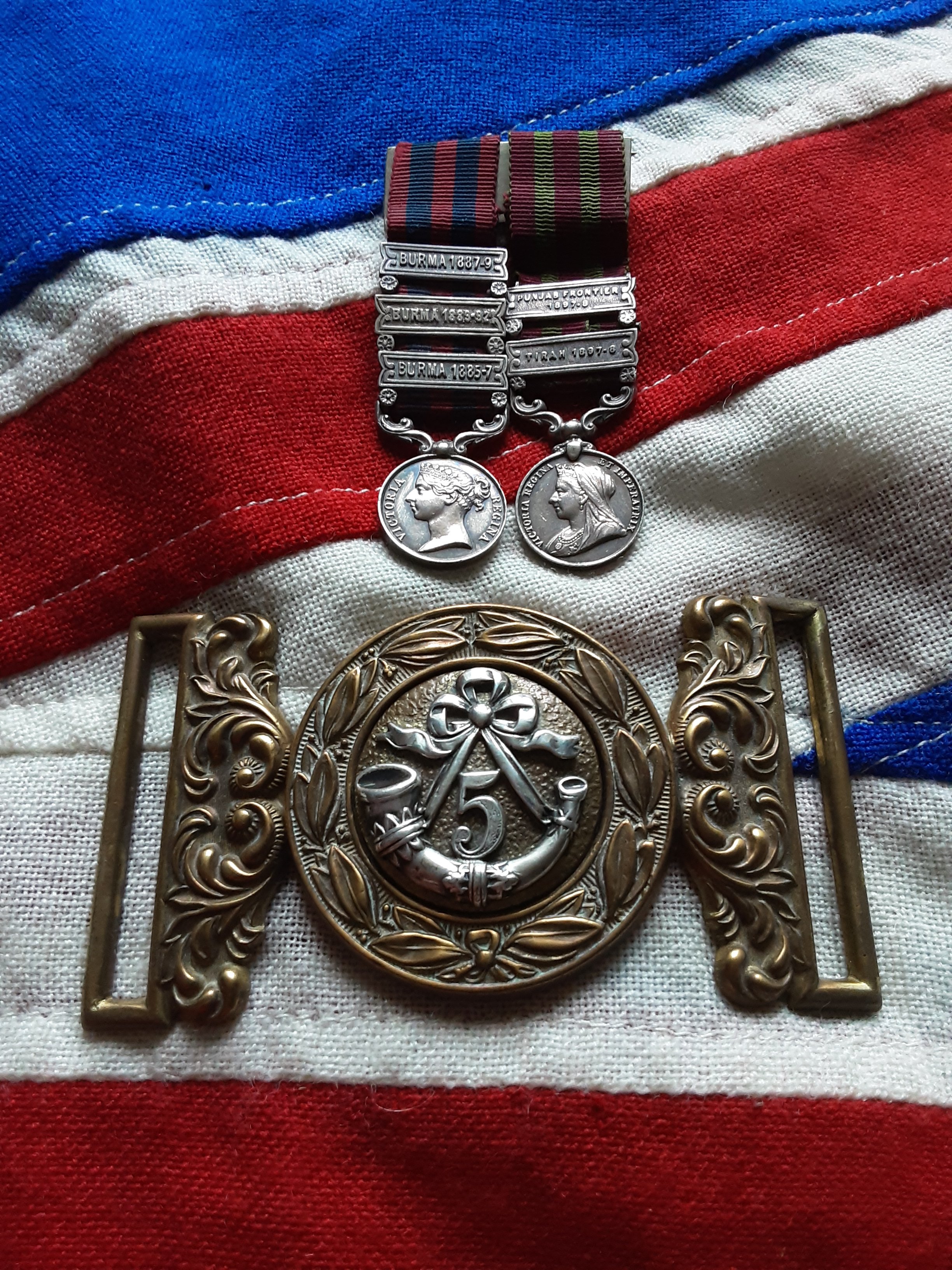 Attributed Victorian period miniatures & belt buckle. Lieut Col A D C Pond. 5th Bengal Infantry.