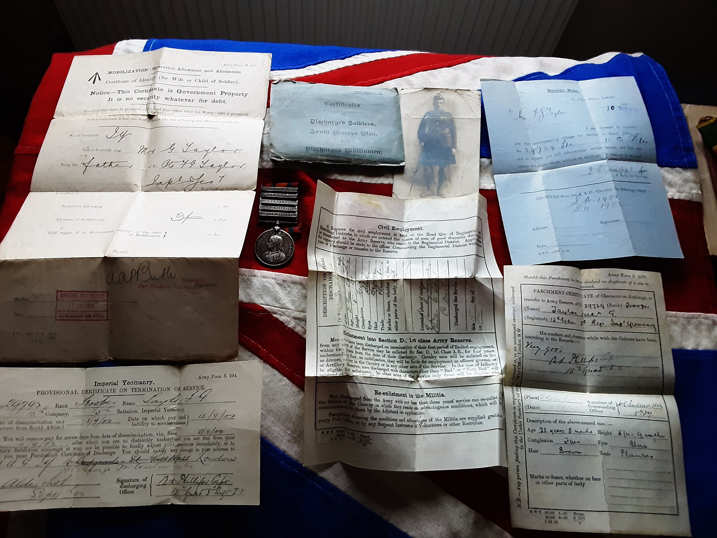 5 clasp QSA with ephemera. Frederick G Taylor.15th Northumberland Company Imperial Yeomanry. Gateshead.